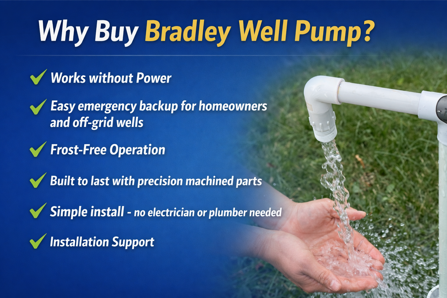 “This is the very best buy if you are looking for a PVC hand pump for your water well. I’ve searched the internet for days and finally came to this hand pump and bought one. It arrived quickly and was as described, and the owner of the company will go over installation step-by-step. If there is any problem, he will help solve it quickly. I cannot put my gratitude in words — this is the place to get a PVC hand pump. The price is right and reasonable!”